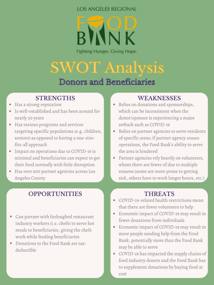 An analysis of the strengths, weaknesses, opportunities, and threats of the Los Angeles Regional Food Bank as perceived by donors and by beneficiaries