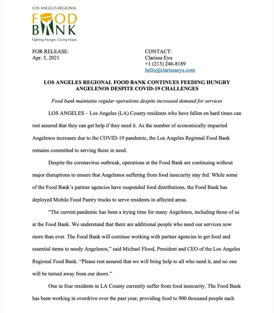 News Release: Los Angeles Regional Food Bank Continues Feeding Hungry Angelenos Despite COVID-19 Challenges
