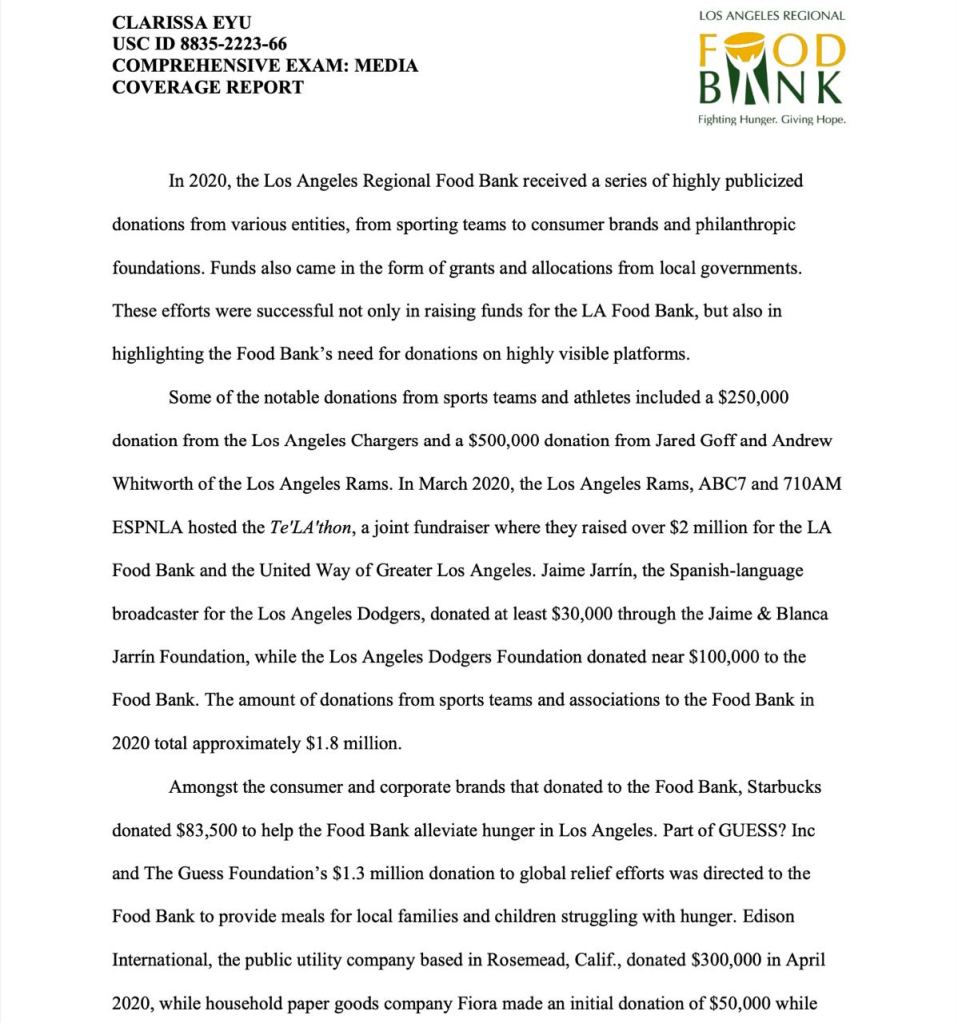 *Disclaimer: Documents on this page were submitted as part of the comprehensive exam for the Strategic Public Relations program at the USC Annenberg School for Communication and Journalism. The below content does not, in any way, constitute official material from the Los Angeles Regional Food Bank.